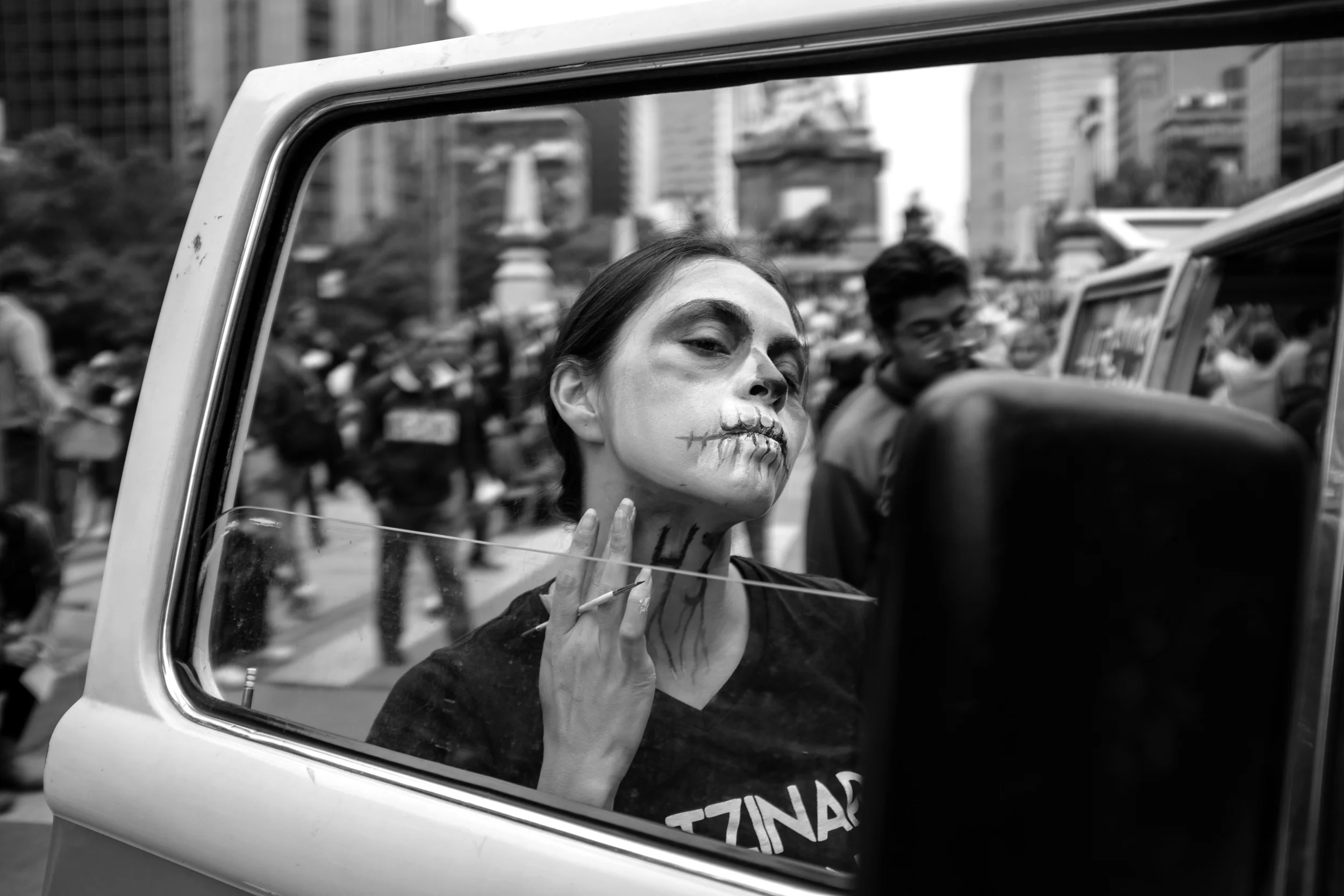 A protestor paints "43" on her neck during a demonstration in Mexico City, Mexico to demand the return of teaching students abducted while on a bus last year. PHOTO CREDIT: MEGHAN DHALIWAL.